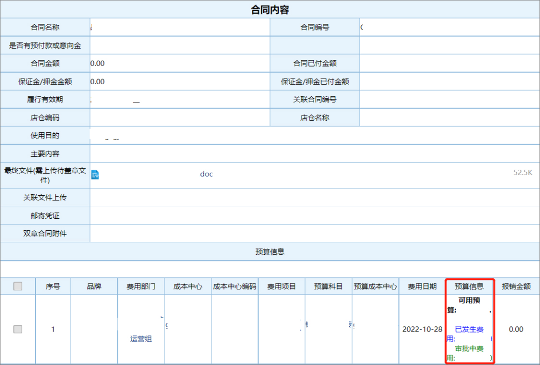 同时,在合同发起表单中,带出预算信息,可快速查看可用预算和已发生费用,严格把控合同费用;快速引用相对方信息,关联预付款信息,引入押金/保证金管理,预设合同印章使用信息等,实现合同全方位管理。