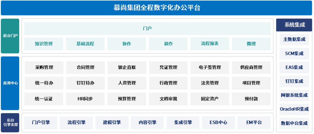 此次,慕尚集团携手泛微OA,搭建了融合统一、全流程覆盖、业财一体化的全程数字化平台,集成各类业务系统,同步主数据,让内部员工、供应商、代理商/经销商都能通过一个平台进行业务协同、事务沟通。