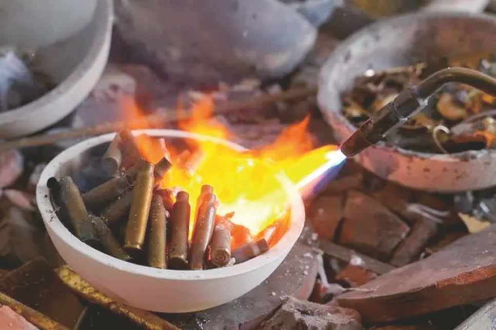 在柬埔寨金边,一名珠宝手工艺人将废弃的子弹壳熔化后制作成精美的饰品。这是3月29日在柬埔寨金边拍摄的用弹壳等原料制成的饰品。