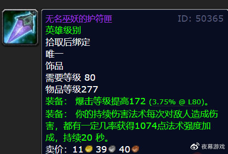 毫无疑问,该饰品的特效真的很吸引某些职业,不仅是痛苦术,对于暗牧、鸟德、元素萨而言都是毕业级的,完全不次于另一个饰品被摘除的外物。