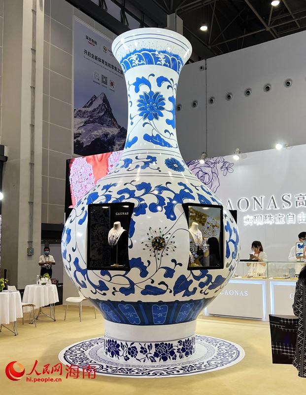 珠宝展区一座4.5米高的青花瓷瓶赚足了观众目光。人民网 蒋成柳摄