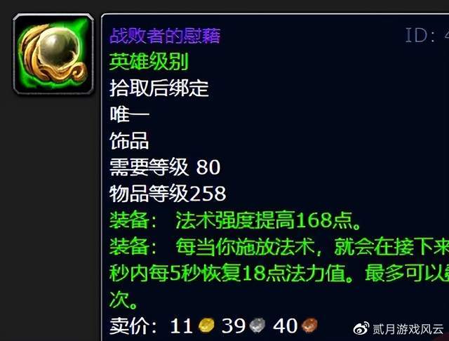 下面来跟大家介绍一下,这个团本最值钱的几个饰品,首先二号BOSS掉落的战败者的慰藉,这是治疗职业的饰品。饰品属性法术强度168点,每次释放法术可以恢复蓝量,在10秒之内,每5秒恢复18点法力值,看起来效果一般,但是这个回蓝是可以叠加的,最多十次。对于绝大多数的治疗职业来说,肯定算是毕业饰品了,前期这件装备起价肯定非常高。