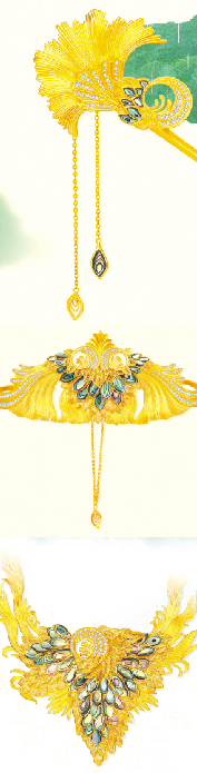 任进为明丰珠宝设计的黄金点钻“凤仪青卿”古法套装系列,使用了素丝、螺钿等传统工艺。 图片由受访者提供