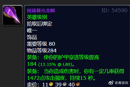 海里昂掉落的最知名的装备当属4个饰品,而锐锋暮光龙鳞这个饰品便是其中之一。在英雄模式下,物品等级高达284,加184点破甲,特效是有一定几率让你获得1472点攻强。不得不说,该饰品算得上物理系DPS职业的毕业饰品,不次于死神的意志,毕竟该饰品的收益更为稳定。