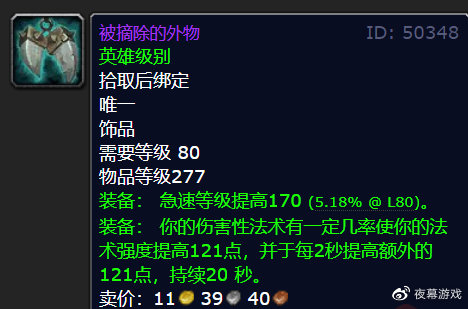 也正因如此,很多玩家觉得被摘除的外物是80级怀旧服中最好的法系DPS饰品,其余几个都差点事。尽管有内置CD,不过战斗开始是肯定会触发的,所以对于DPS提升简直太明显了。