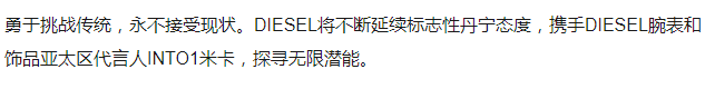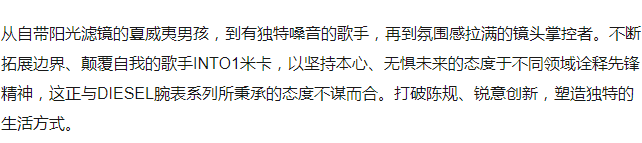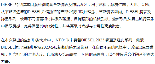 DIESEL欣然宣布歌手INTO1米卡担任DIESEL腕表和饰品亚太区代言人。新季品牌形象大片透过米卡的视角,吸睛呈现,震撼上演。