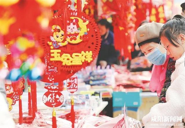 1月12日,市民在市场采购春节饰品。临近春节,兔年挂件、摆件,带有萌兔样式的春联、福字、红包走俏市场,“兔元素”搭配喜庆的中国风年货备受市民喜爱。