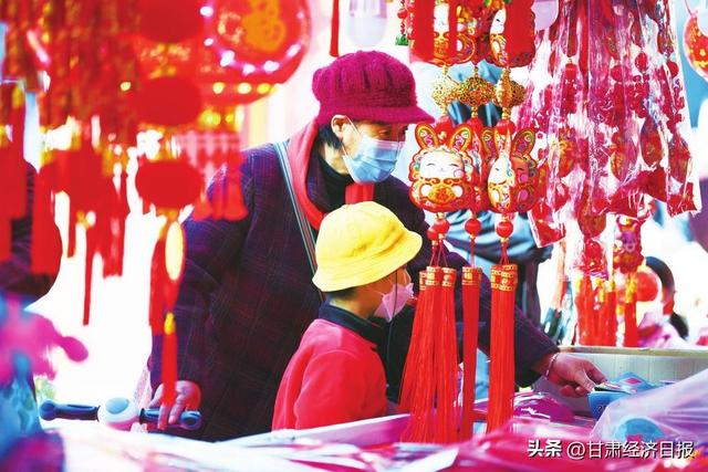 1月12日,顾客在兰州张掖路年货市场选购新年饰品。兔年春节临近,兰州各大市场新年饰品销售红火,中国结、灯笼、对联和兔年生肖饰品等商品吸引不少市民前来选购,处处洋溢着喜庆的节日气氛。