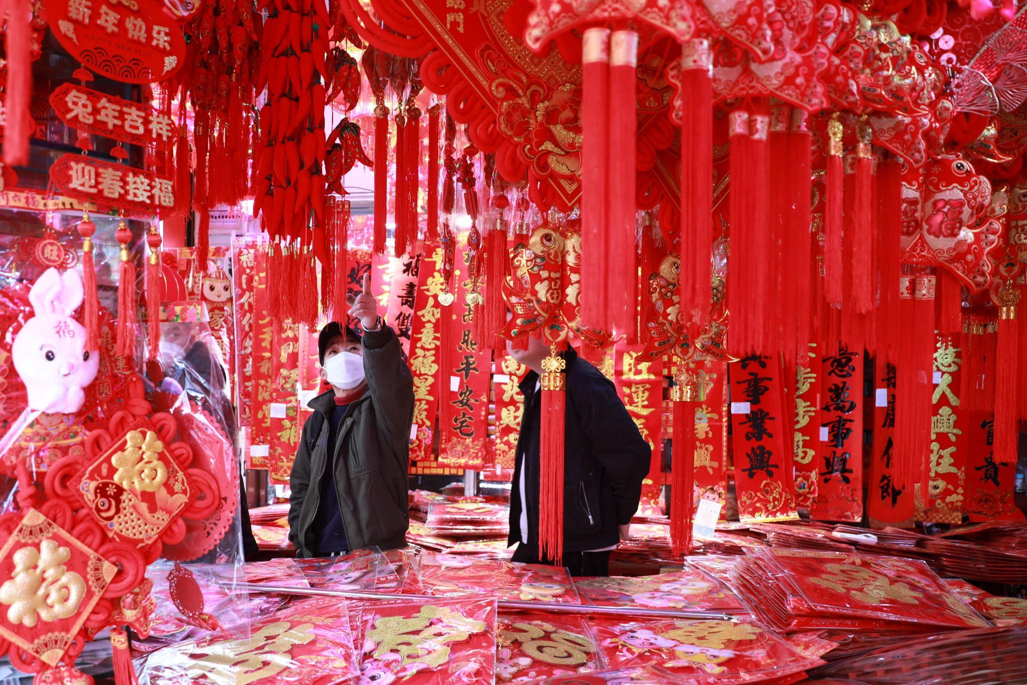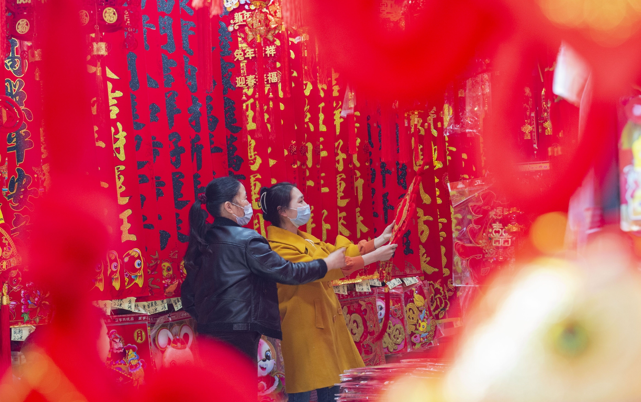 1月12日,在湖南省湘西土家族苗族自治州吉首市一处批发市场,市民在选购春节饰品。新华社发(彭彪摄) 1月12日,人们在湖北省恩施土家族苗族自治州宣恩县兴隆老街选购新春饰品。新华社发(宋文摄)