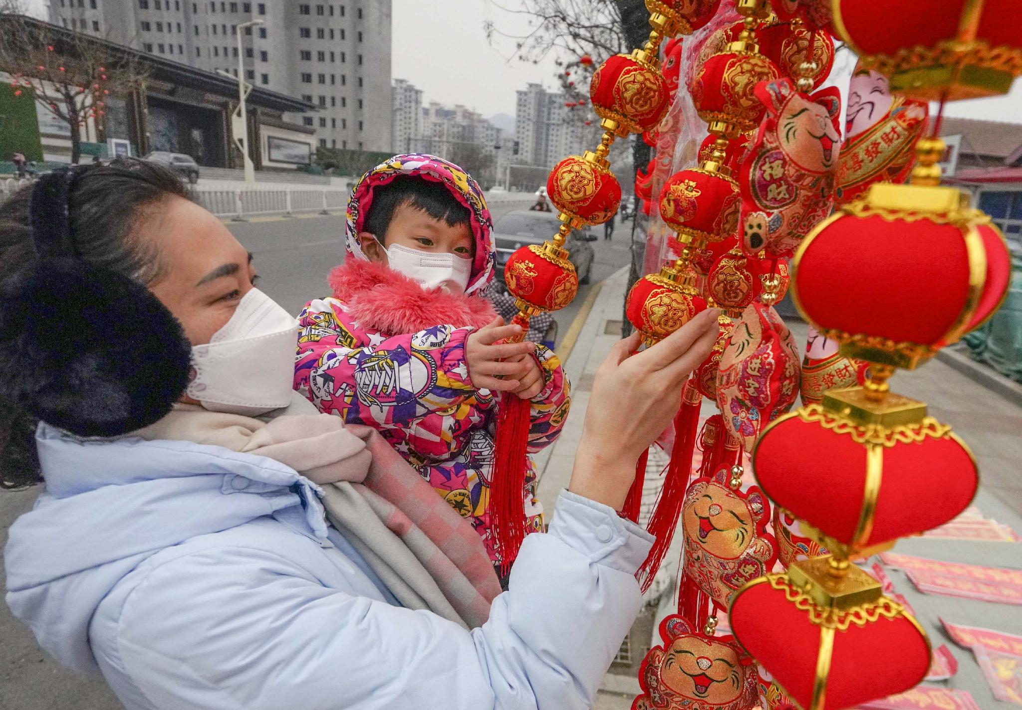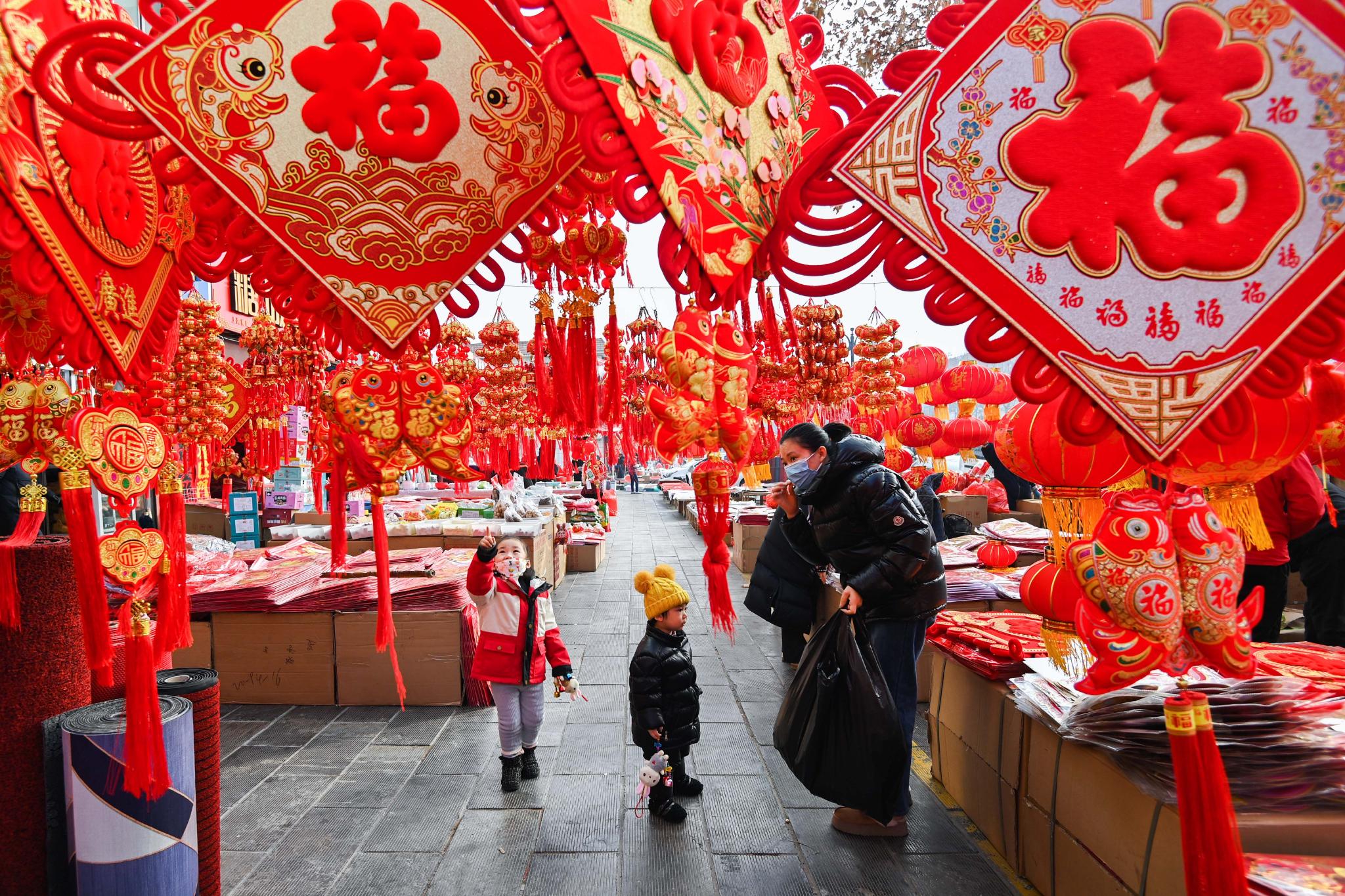1月12日,市民带着孩子在河北省迁西县节庆年货市场选购年货。新华社发(刘满仓摄) 1月12日,市民在山东省青州市一家年货市场选购春节饰品。新华社发(王继林摄)