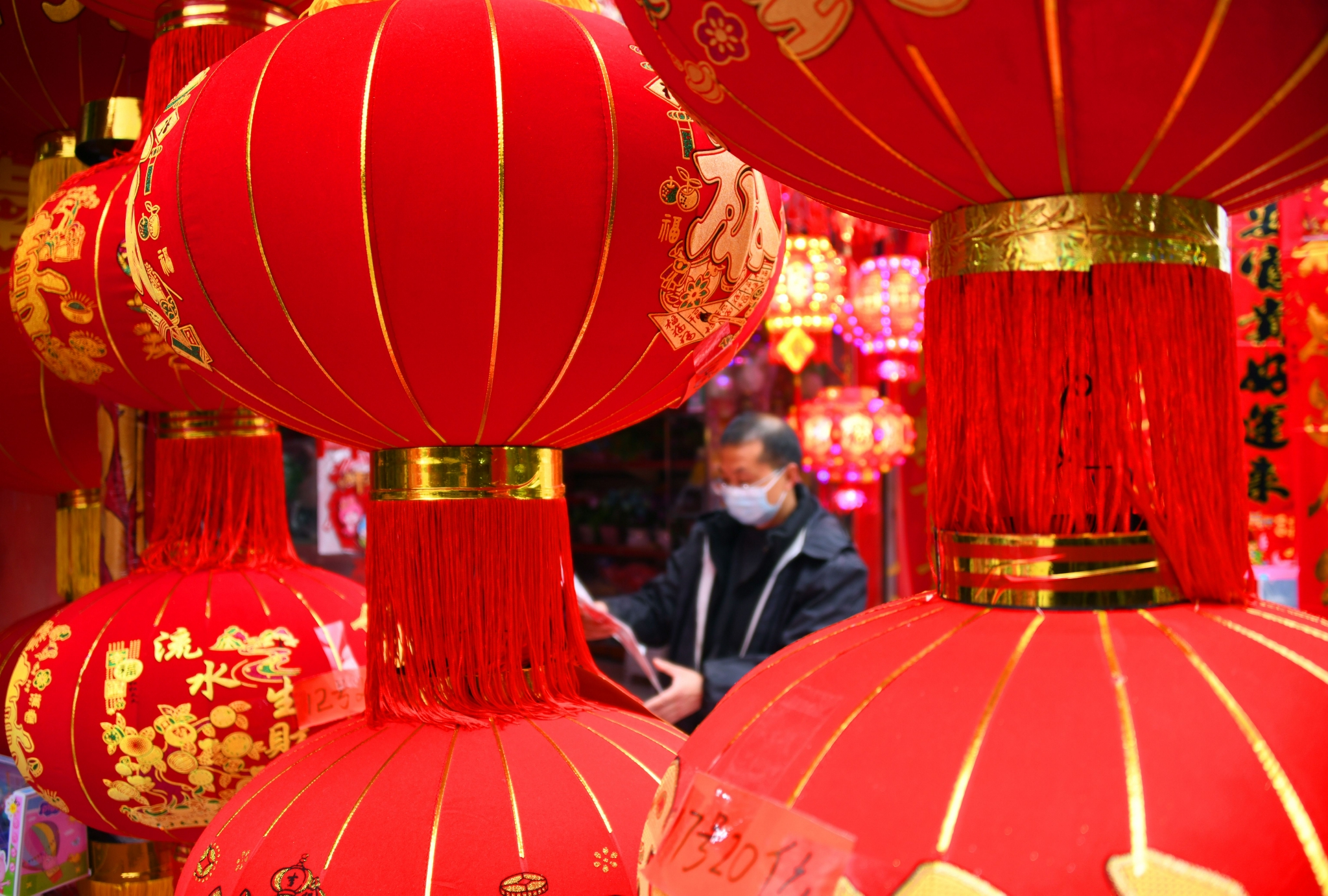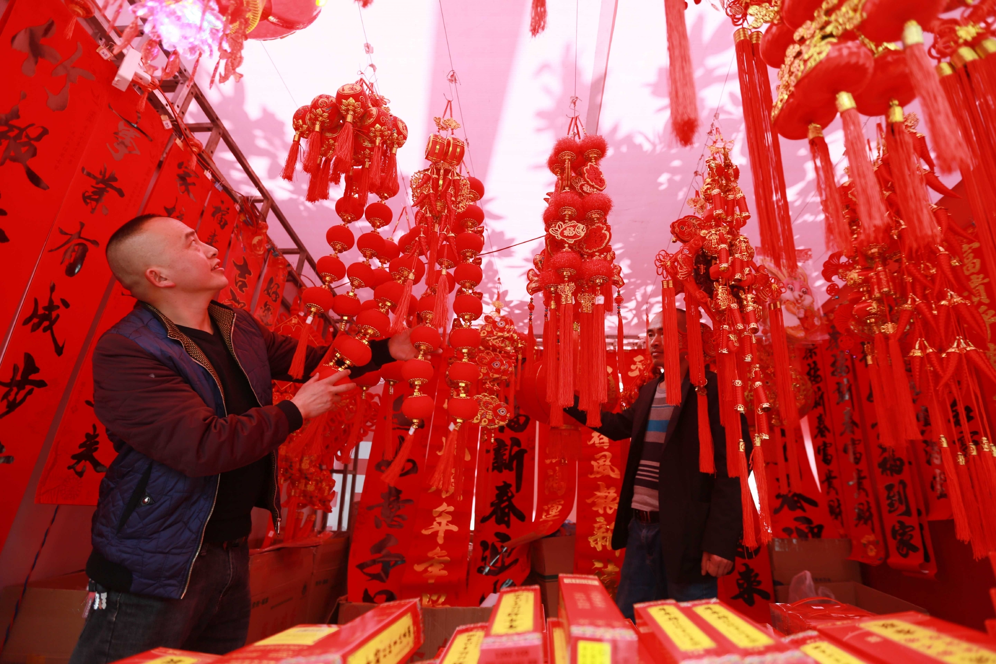 临近春节,各地年货市场热热闹闹,人们忙着选购新春饰品。