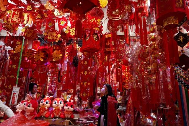 2023年1月11日,郑州陈寨花卉市场内,销售春联、窗花、灯笼等春节饰品的店铺生意红火,新年就要红红火火、热热闹闹,大家都会在新春佳节把自己的家打扮得漂漂亮亮。