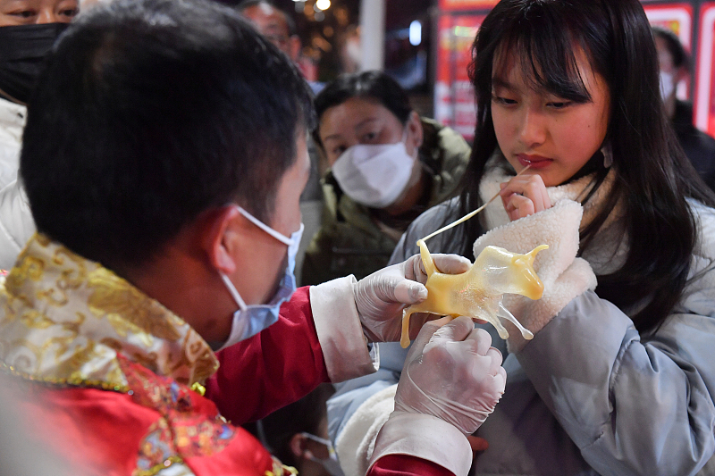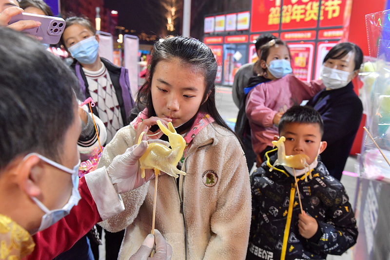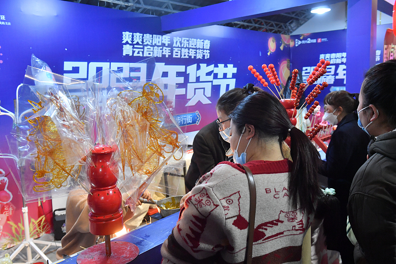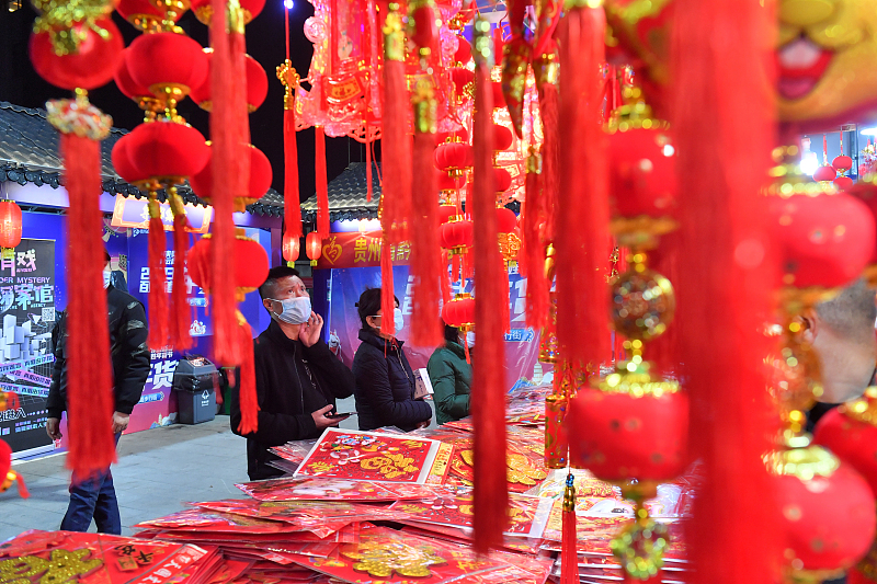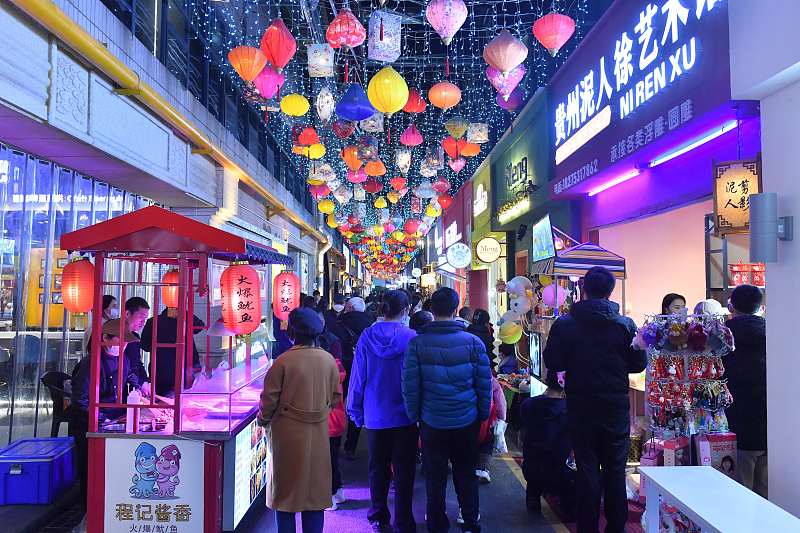 随着春节的临近,贵州省贵阳市青云路步行街夜景璀璨,店铺陆续恢复营业,街面上非遗文化展示与体验、各种特色美食、喜庆饰品、手办、文创、潮物等商品琳琅满目, 吸引不少游客前来逛街和消费,整个街面呈现出浓浓的烟火气。