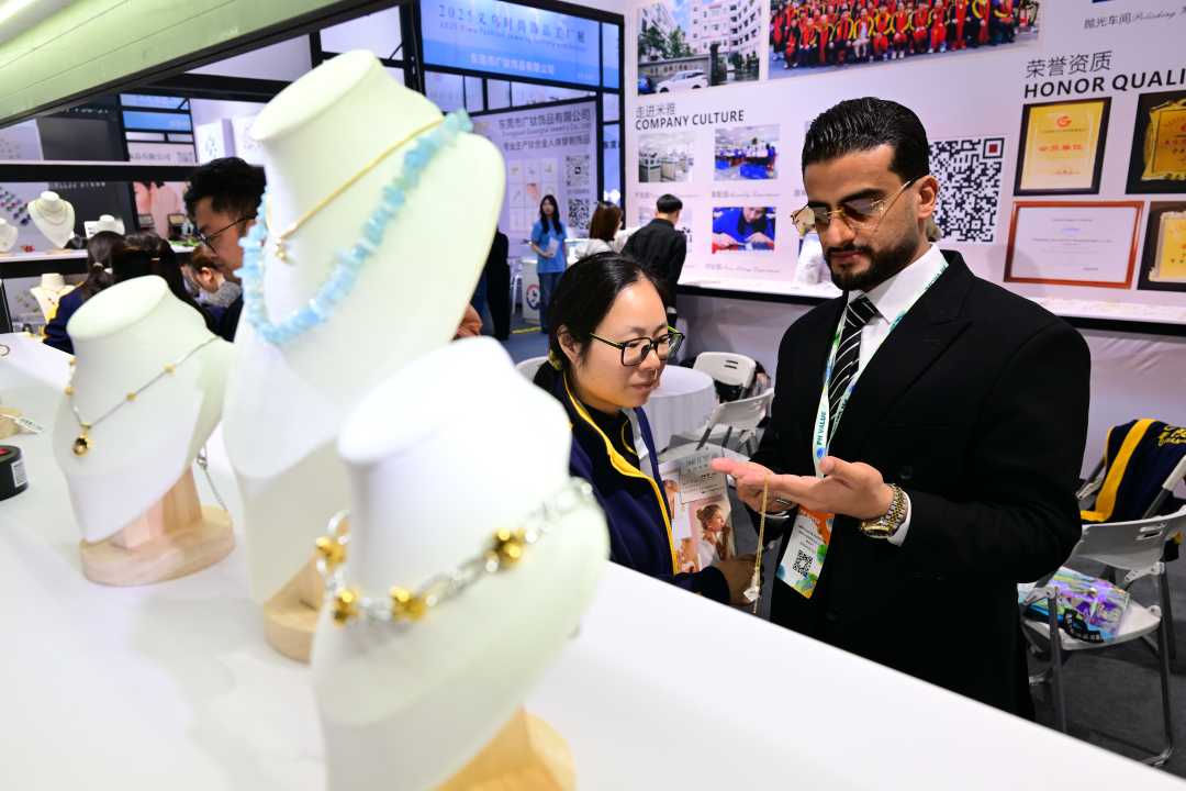4月27日,浙江省金华市义乌国际博览中心,外商在2025义乌时尚饰品工厂展会上洽谈采购业务。