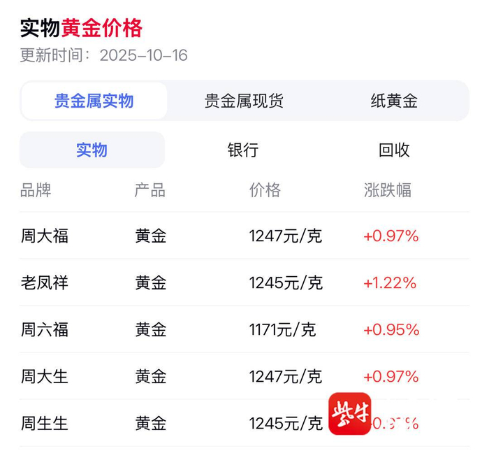 今日国内主要金饰品价格依然“居高不下”,周大福、周大生克金1247元,相比于昨日上涨0.97%;老凤祥、周生生克金1245元,分别上涨1.22%、0.97%;周六福克金1171元,上涨0.95%。