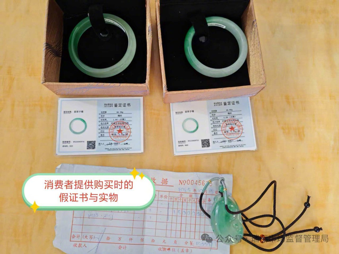 【#游客在瑞丽花1.5万元买A货翡翠实为假货#,市监局:已挽回货款并赔偿】#游客在瑞丽买到假翡翠获赔5000元# 近日,瑞丽市市场监管二所根据消费者提供的投诉举报线索,查处了一起销售假冒珠宝翡翠饰品违法行为,为消费者挽回货款15000元,赔偿5000元,查扣涉案假冒翡翠吊坠1个、手镯2只。据悉,该案起于一昆明游客王某到瑞丽姐告国门旅游打卡,在某珠宝店以15000元购买了翡翠吊坠一个、手镯2只。购买时商家口头承诺是缅甸翡翠A货否则退一赔三,其中2只手镯还出具了金银珠宝首饰质量检测中心鉴定证书。购买后,王某因当心被骗买到假货便到瑞丽市珠宝玉石检测机构进行鉴定,鉴定报告结果显示翡翠吊坠为石英质玉(俗称非洲翠)、2只手镯为翡翠(处理)。目前该案正在进一步办理中。 (界面)