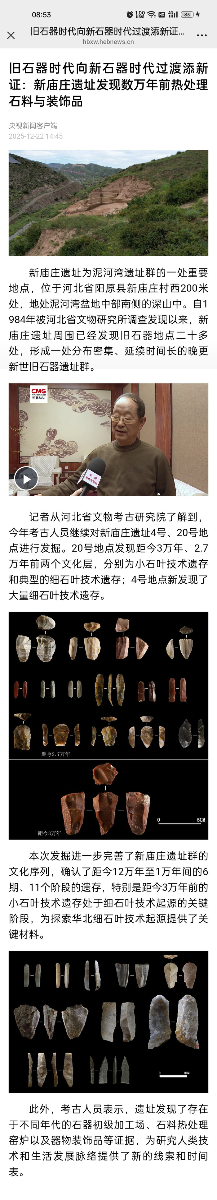 【旧石器时代向新石器时代过渡添新证:新庙庄遗址发现数万年前热处理石料与装饰品】新庙庄遗址为泥河湾遗址群的一处重要地点,位于河北省阳原县新庙庄村西200米处,地处泥河湾盆地中部南侧的深山中。自1984年被河北省文物研究所调查发现以来,新庙庄遗址周围已经发现旧石器地点二十多处,形成一处分布密集、延续时间长的晚更新世旧石器遗址群。(公众号/央视新闻客户端)