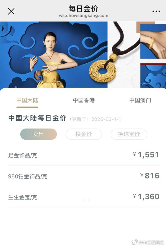 2月14日,国内品牌足金饰品价格跟涨,周生生足金饰品标价1551元/克。较前一日1524元/克上涨27元/克。