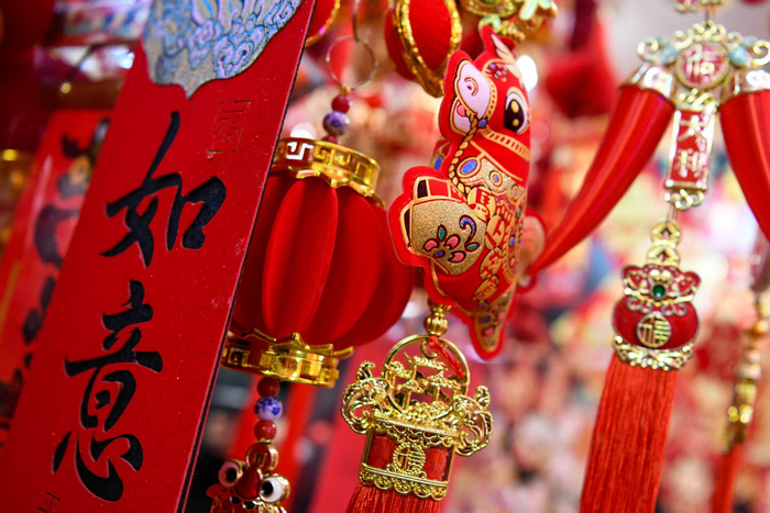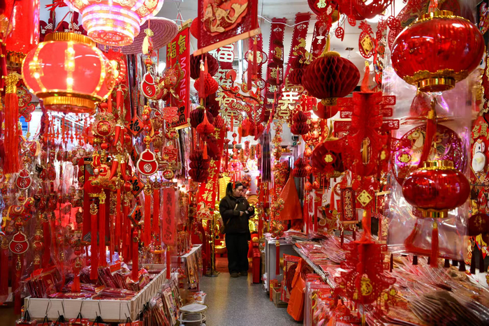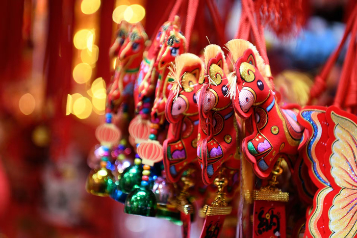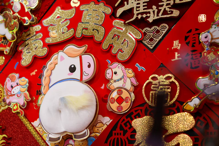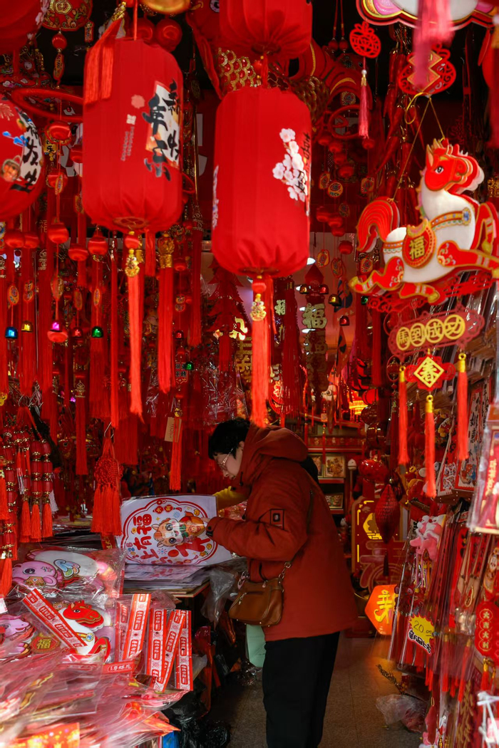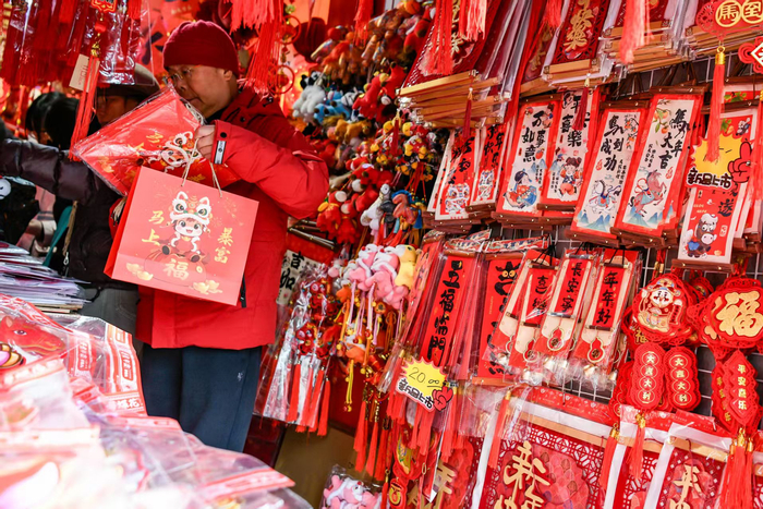 连日来,为给新年增添喜气,位于城隍庙附近的福佑路小商品市场十分热闹,春节工艺品琳琅满目、传统的春联、福字、红灯笼、马年贴画、马型挂件不断上架……