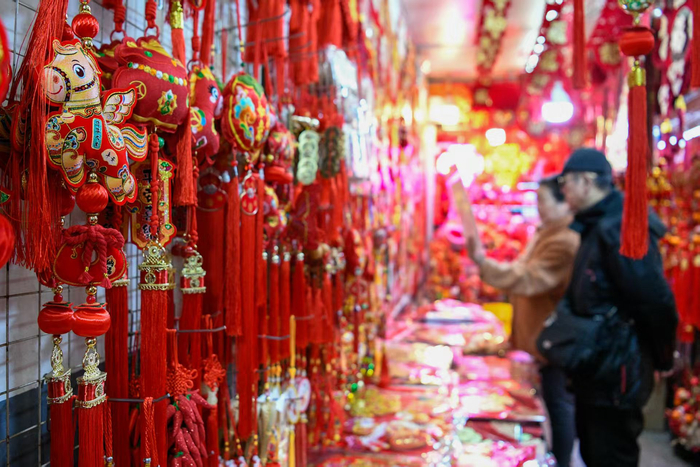 不少市民抓紧时间购置年节饰物,行走在一片红红火火之中。